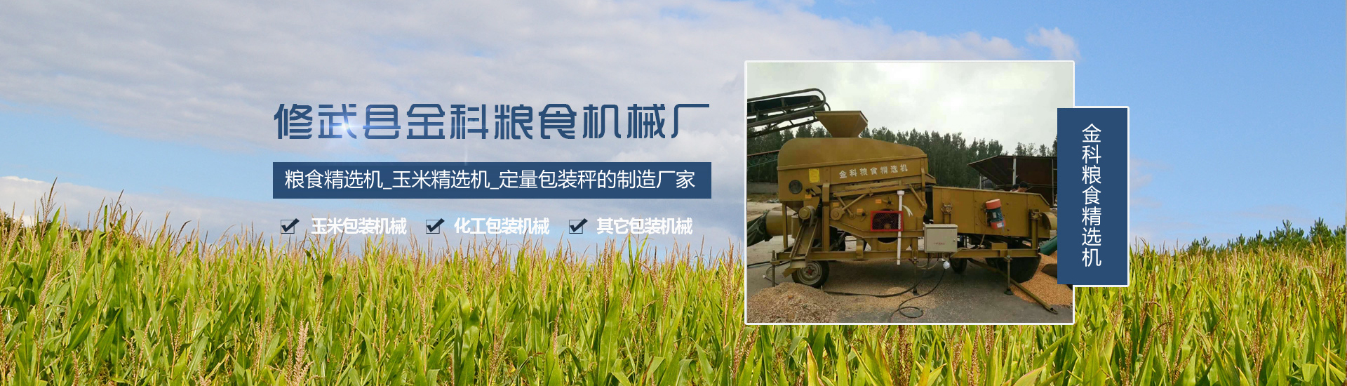 / ABOUT US查看更多+修武縣金科糧食機械廠,研制開發(fā)了多種系列糧食精選機,電子秤,包裝秤,分裝機,玉米脫粒機,脫粒機輸送機,皮帶機,除塵器,脈沖除塵器,提升機,絞龍,糧食上料機等糧食機械。,在使用中得到各地用戶的一致好評! 另外專注生產(chǎn)的計量包裝秤,產(chǎn)品主要應用于玉米包裝機械,化工包裝機械,以及其它包裝機械。產(chǎn)品銷往玉米加工廠家,面粉加工廠家,化肥廠家等。